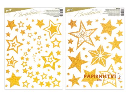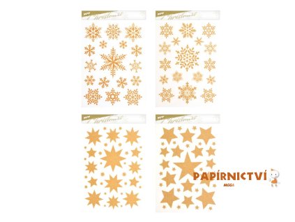 Vánoční okenní fólie glitrová s motivy zlatých hvězd a vloček. Pomocí okenních fólií si velmi snadno a rychle vytvoříte vánoční atmosféru na celé svátky. Fólie se lehce...