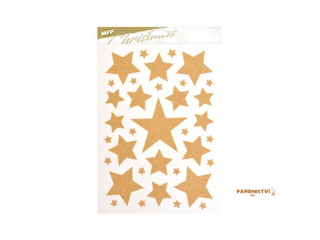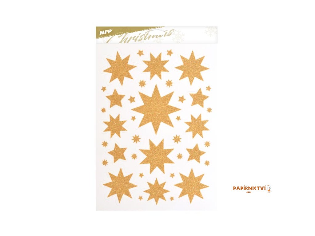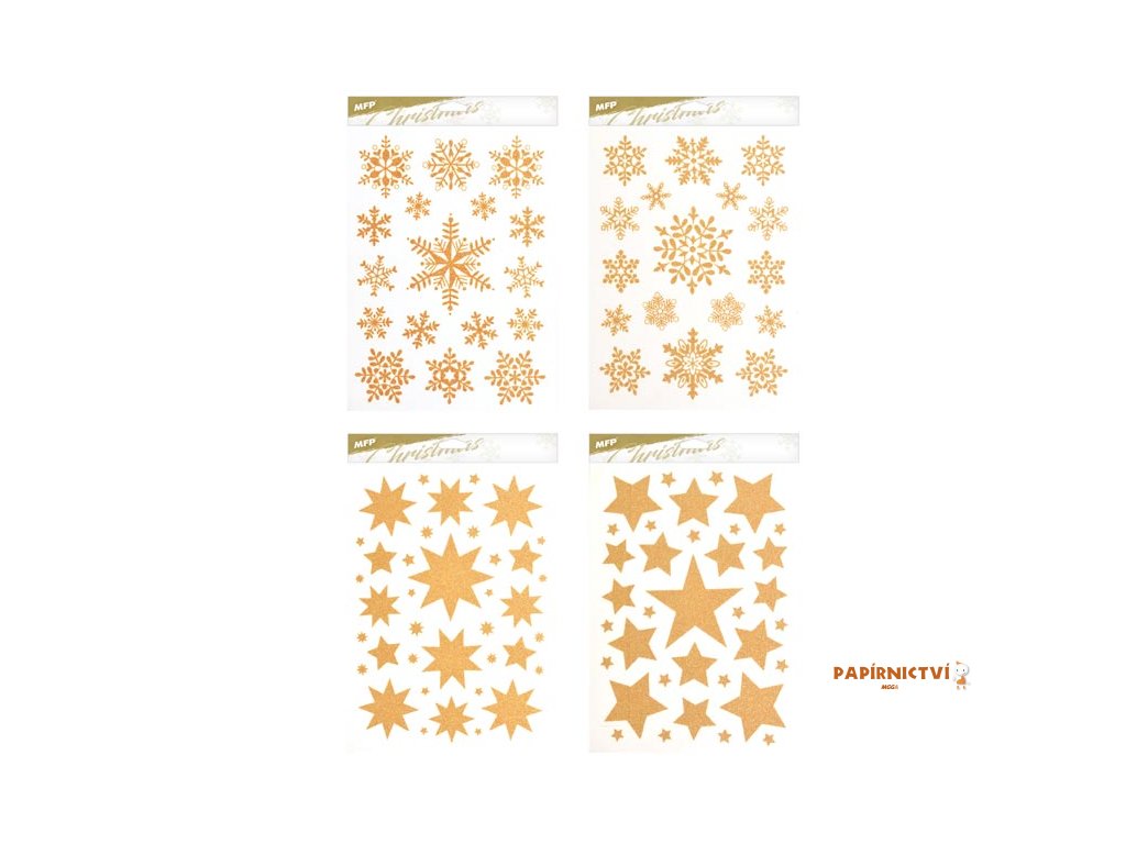 Vánoční okenní fólie glitrová s motivy zlatých hvězd a vloček. Pomocí okenních fólií si velmi snadno a rychle vytvoříte vánoční atmosféru na celé svátky. Fólie se lehce odlepují a nalepují a nezanechávají za sebou žádné stopy lepidla.NÁVOD: