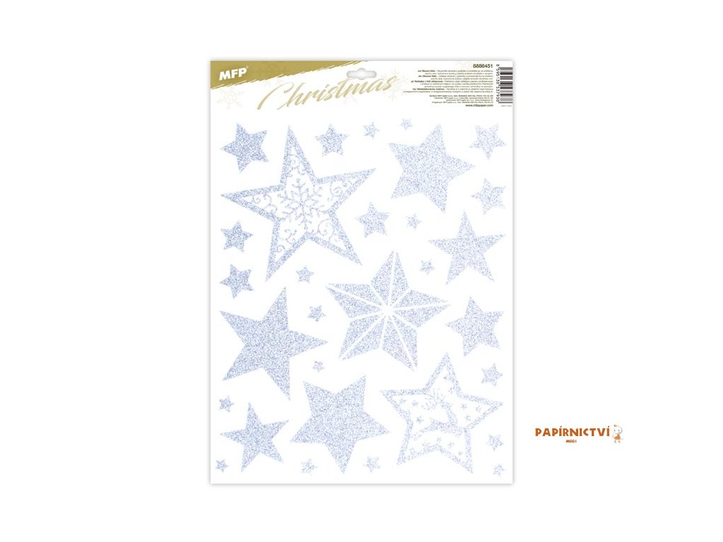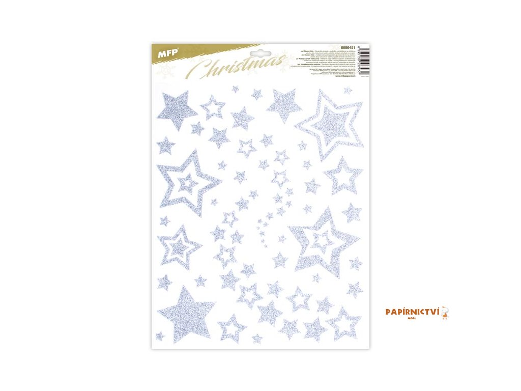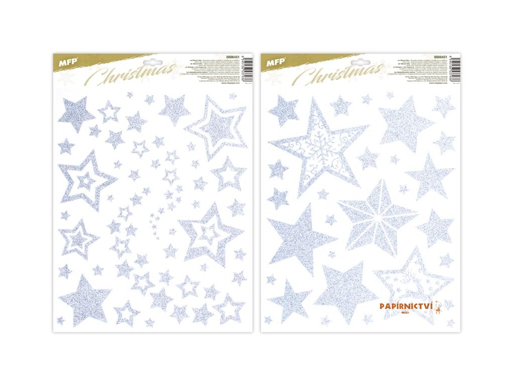 Vánoční okenní fólie s motivem stříbrných hvězd s glitry. Pomocí okenních fólií si velmi snadno a rychle vytvoříte vánoční atmosféru na celé svátky. Fólie neobsahuje lepidlo, jednoduše elektrostaticky přilne na čistém okně, zrcadle apod.NÁVOD: