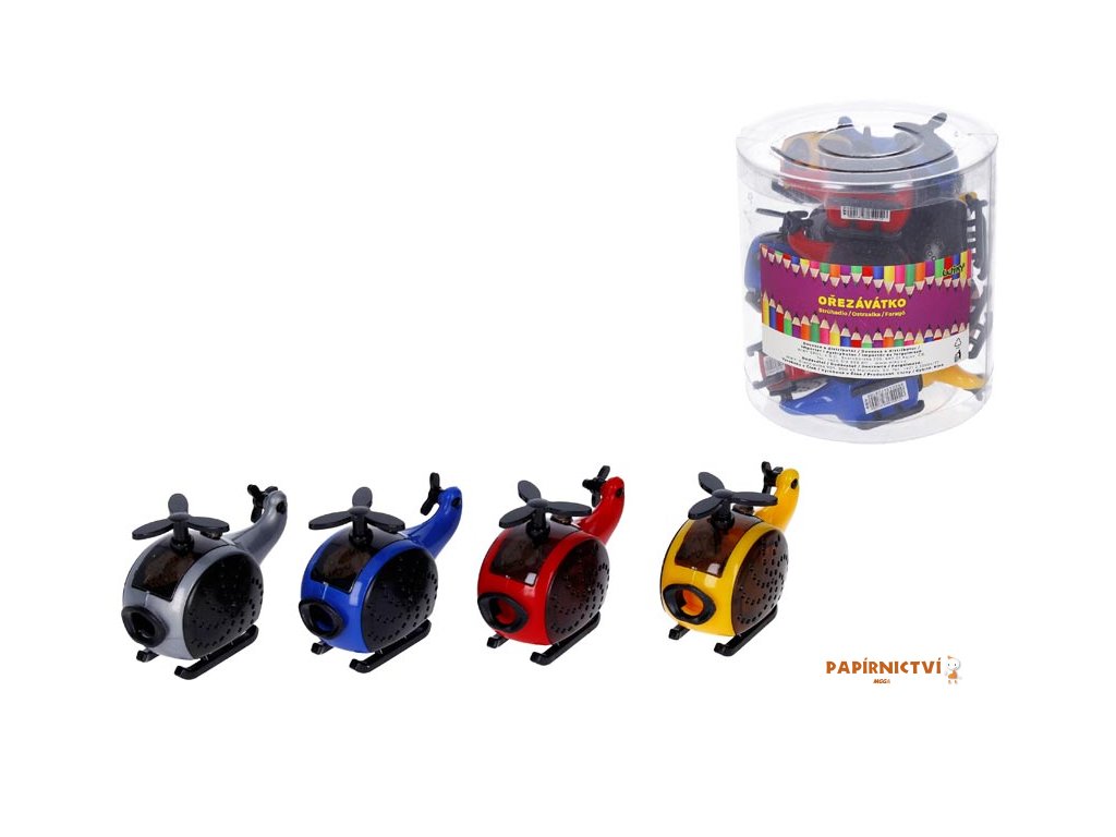 Ořezávátko na jednu tužku se zásobníkem ve tvaru helikoptéry. Nezbytná součást školáka nebo kanceláře.Barva: šedá, modrá, červená, žlutá