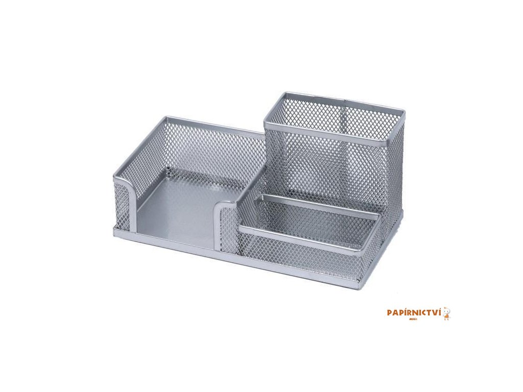 Cerný kovový organizér o rozmerech 20 x 10 x 10cm, se stojánkem na tužky, prihrádkou na kancelárské doplnky a kostkou na poznámkový blocek.Doplňkové parametry