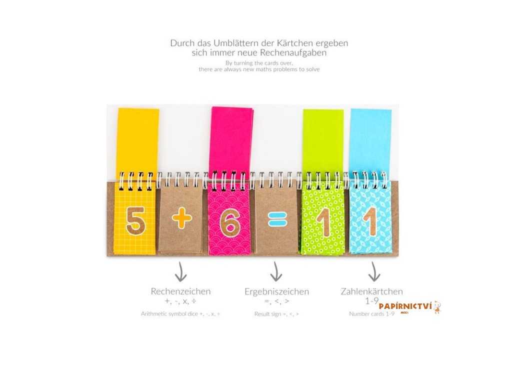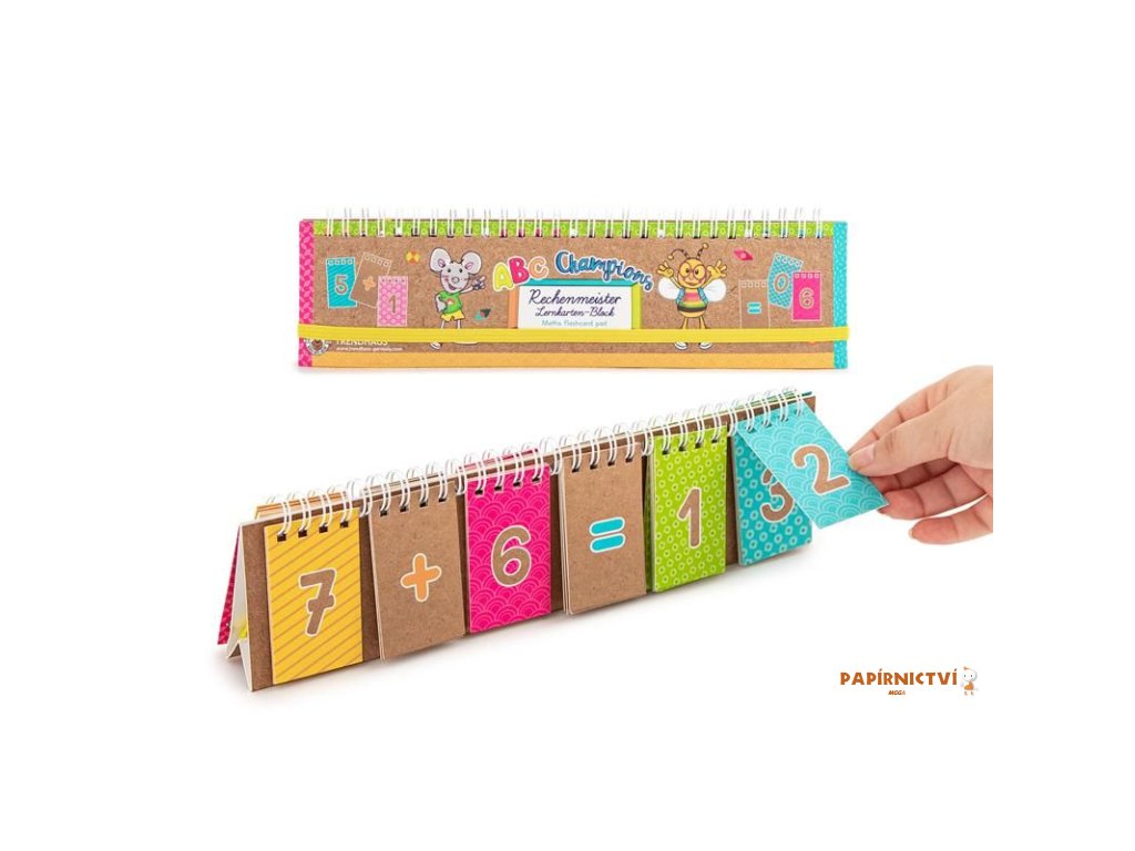 Staňte se mistrem matematiky! Ať už se jedná o sčítání, odčítání, násobení nebo dělení – s tímto blokem karet vyrobeným z pevného spirálově vázaného kartonu se děti mohou snadno naučit základní aritmetiku a pilně procvičovat. Když otočíte karty, vyvstanou nové problémy s výpočty, které je třeba vyřešit. Kompletní? Poté jej jednoduše uzavřete praktickou gumičkou a zabalíte.
