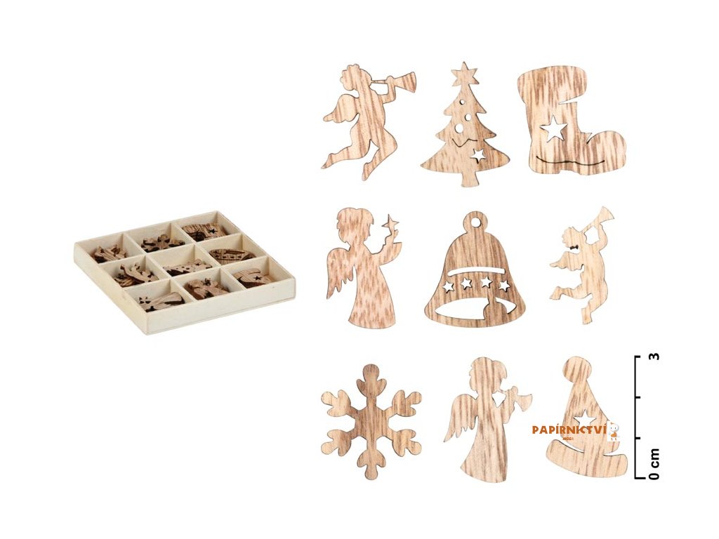 - 27 ks dřevěných ozdob (andílci, stromečky, vločky aj.)