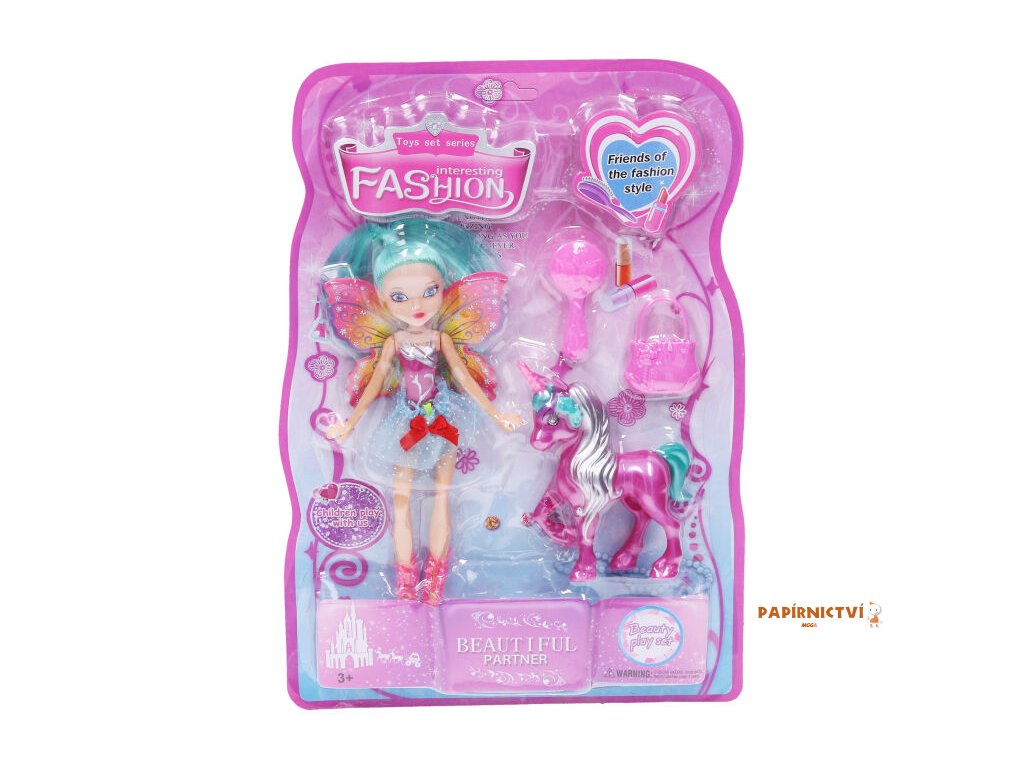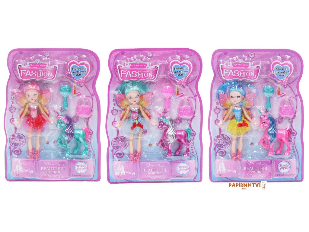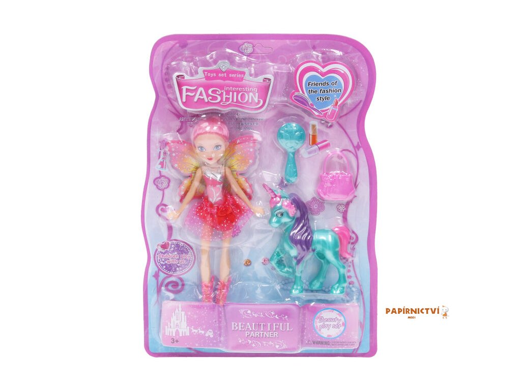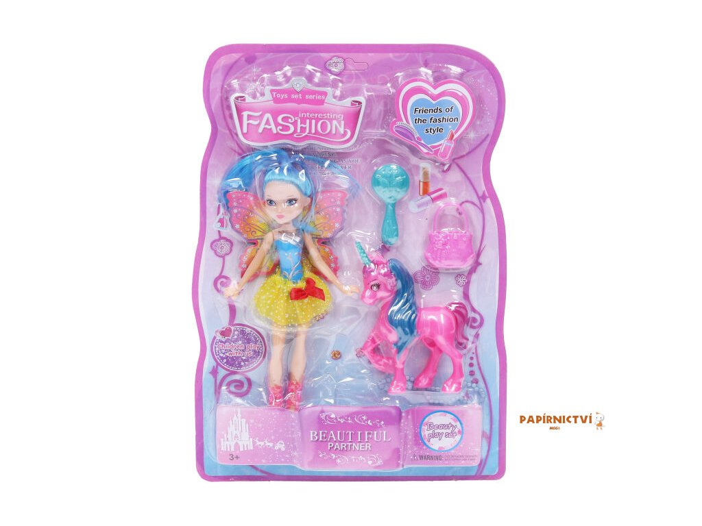 Panenka víla s jednorožcem. Velikost panenky 21 cm. Součástí víla, hřeben, kabelka, jednorožec.