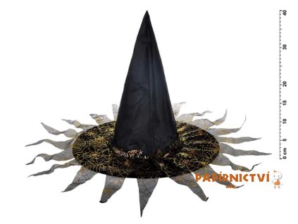 Čarodějnický klobouk s výrazným designem. Klobouk má klasický špičatý tvar, vyrobený z černé látky, která působí elegantně a tajemně. Kolem okraje klobouku je širší krempa...