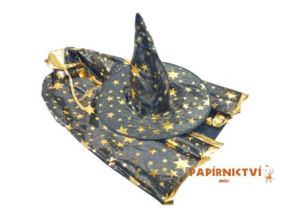 Čarodějnický set plášť + klobouk. Čarodějnický plášť i klobouk je se zlatými hvězdami. Tento set využijete jako kostým černokněžníka či kouzelníka. V černozlaté kombinaci barev...