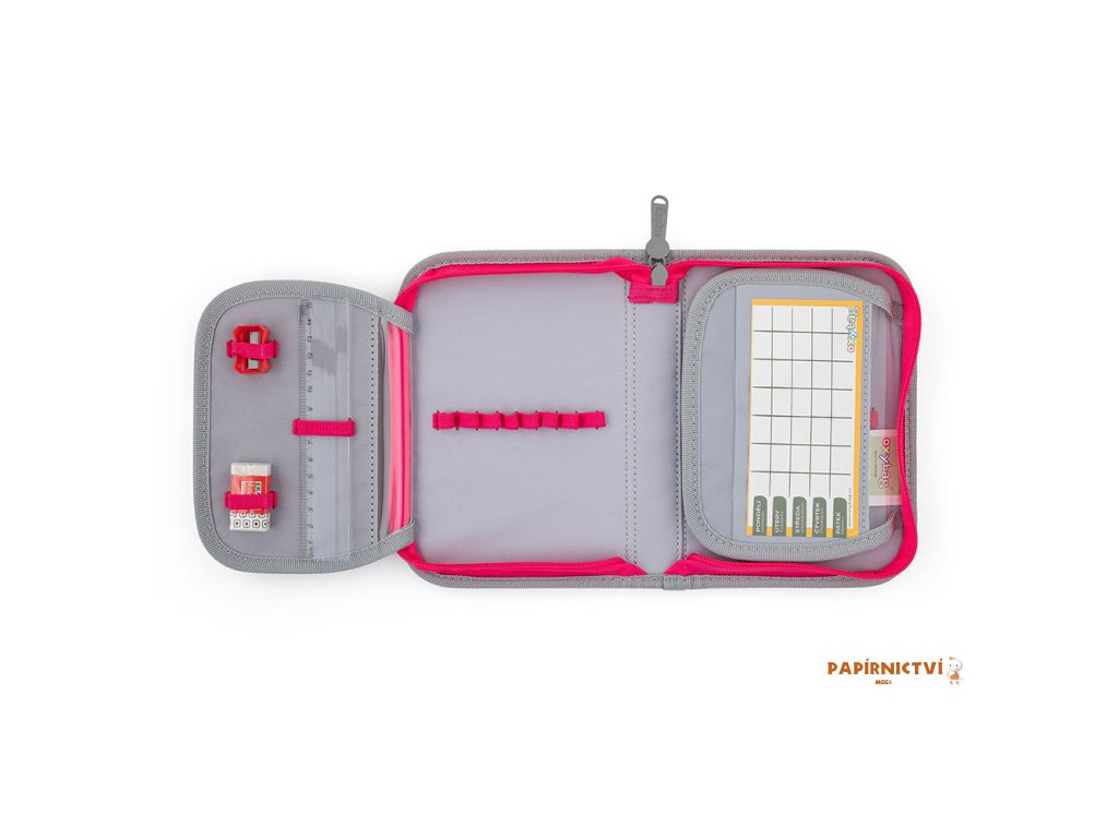 Jednopatrový školní penál s plyšovým efektem se 2 chlopněmi, prázdný obsahuje 25 gumových poutek pro uchycení psacích potřeb. Na vnitřních chlopních jsou průhledné fólie pro rozvrh hodin.