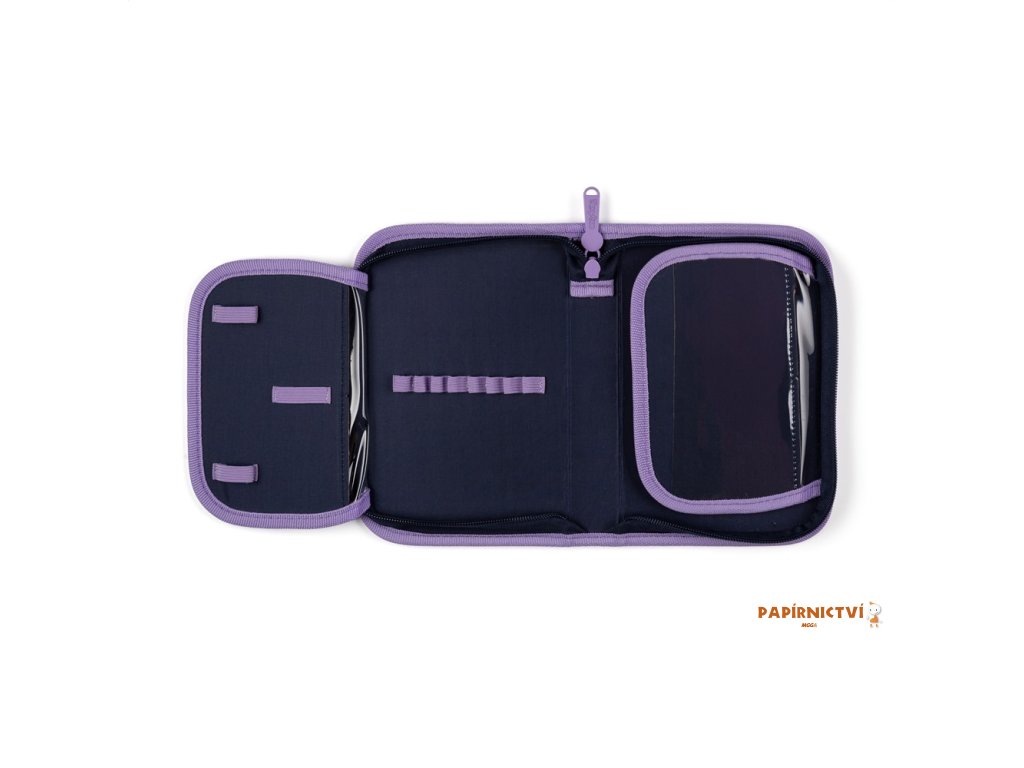 Jednopatrový školní penál s 2 chlopněmi, prázdný obsahuje 25 gumových poutek pro uchycení psacích potřeb. Na vnitřních chlopních jsou průhledné fólie pro rozvrh hodin.