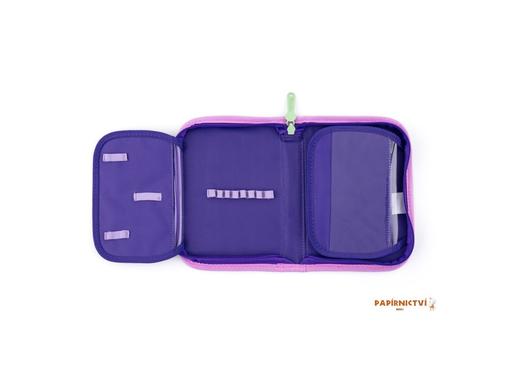 Jednopatrový školní penál s 2 chlopněmi, prázdný obsahuje 25 gumových poutek pro uchycení psacích potřeb. Na vnitřních chlopních jsou průhledné fólie pro rozvrh hodin.