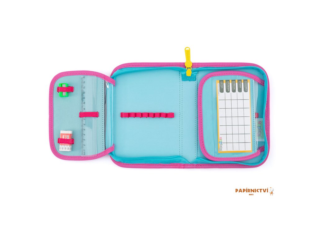 Jednopatrový školní penál s 2 chlopněmi, prázdný obsahuje 25 gumových poutek pro uchycení psacích potřeb. Na vnitřních chlopních jsou průhledné fólie pro rozvrh hodin.