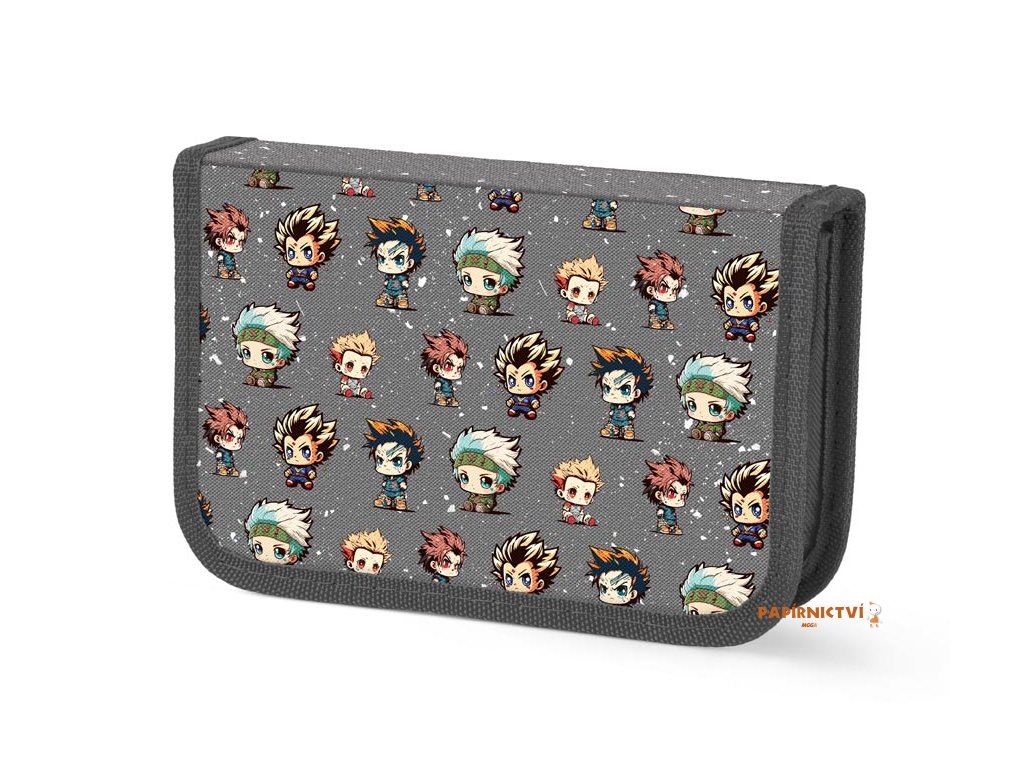Školní jednopatrový nevybavený penál se dvěma chlopněmi v tmavě šedé barvě s motivem anime maskotů. Chlopně mají na vnější straně praktickou průhlednou kapsičku na rozvrh. Penál obsahuje 23 poutek na pastelky, tužky a pera a 3 větší poutka např. na nůžky, gumu, ořezávátko nebo pravítko. Velice lehce se uzavírá díky velkému zipu. Bezesporu je nezbytnou součástí vybavení každého školáka.- není vybavený
