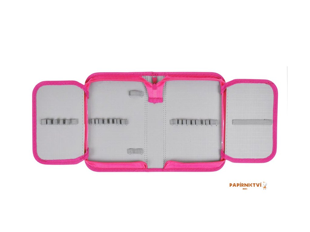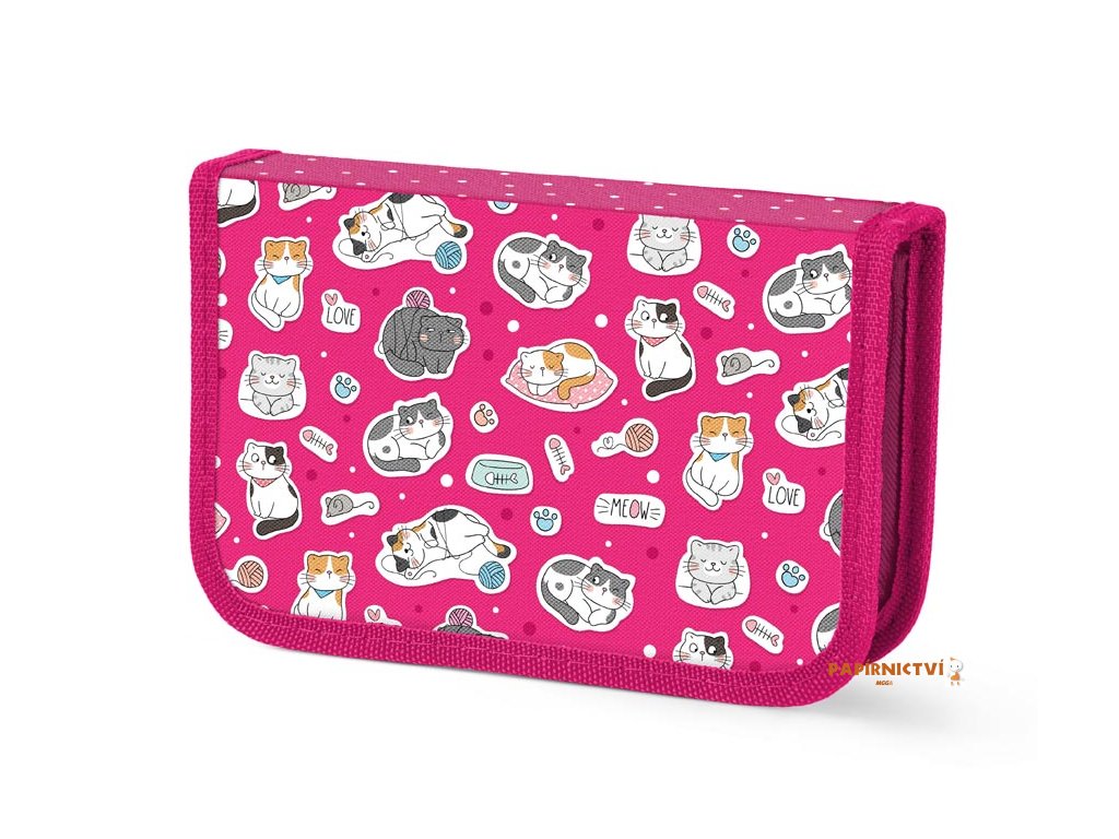 Školní jednopatrový nevybavený penál se dvěma chlopněmi v sytě růžové barvě s motivem koček. Chlopně mají na vnější straně praktickou průhlednou kapsičku na rozvrh. Penál obsahuje 23 poutek na pastelky, tužky a pera a 3 větší poutka např. na nůžky, gumu, ořezávátko nebo pravítko. Velice lehce se uzavírá díky velkému zipu. Bezesporu je nezbytnou součástí vybavení každého školáka.- není vybavený