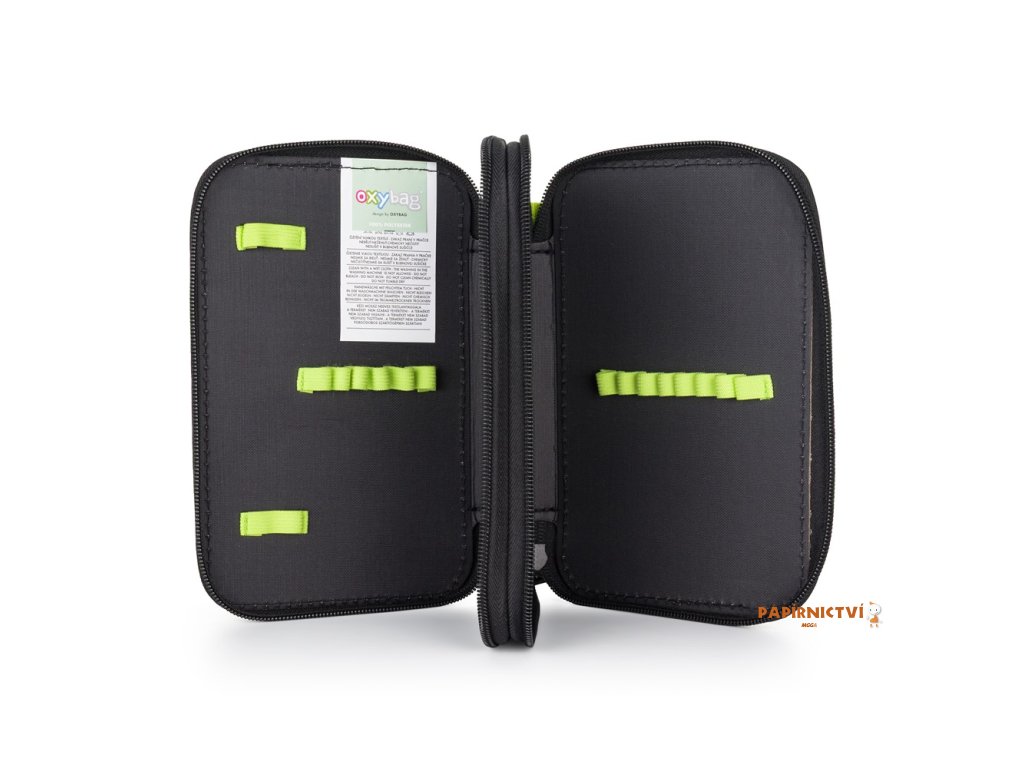 Školní penál dvoupatrový bez náplně. Penál obsahuje 25 gumových poutek pro uložení všech psacích potřeba a drobností potřebných k výuce. Penál má pevný zip s velkými taháčky pro snadnou manipulaci. Jedno patro je opatřeno průhlednou přihrádkou pro týdenní rozvrh.