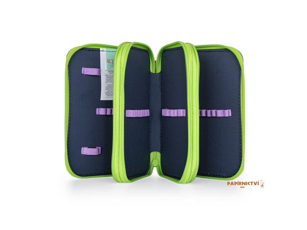 Školní penál třípatrový bez náplně. Penál obsahuje 40 gumových poutek pro uložení všech psacích potřeb a drobností potřebných k výuce. Penál má pevný zip s velkými taháčky pro snadnou manipulaci. Jedno patro je opatřeno průhlednou přihrádkou pro týdenní rozvrh.