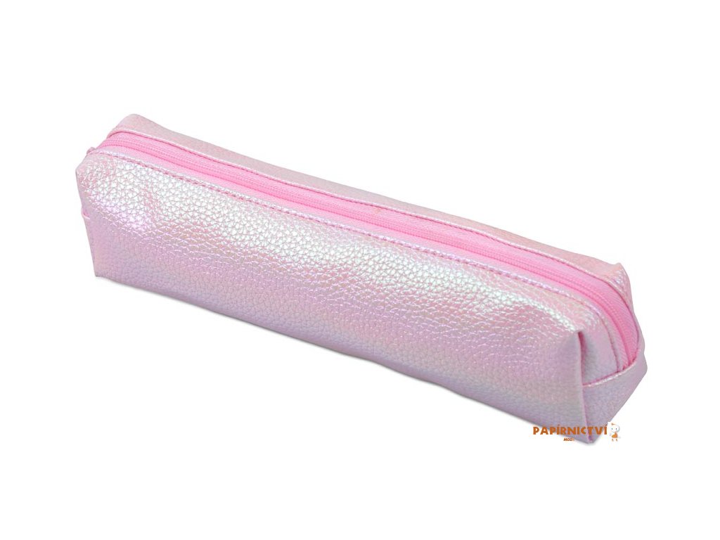 Školní penál/etue mini s perleťovým povrchem v růžové barvě. Povrch penálu se leskne a vytváří efekt měňavého třpytu, který se mění podle úhlu dopadu světla. Zip je růžový, ladící s celkovým designem penálu. Tento úzký, kompaktní penál je vhodný pro uložení několika základních psacích potřeb, jako jsou pera nebo tužky, a díky svému lesklému a elegantnímu vzhledu je atraktivní volbou pro ty, kdo hledají stylový a moderní doplněk do školy či kanceláře.- není vybavený