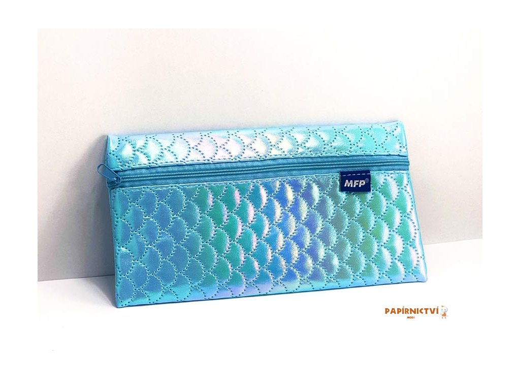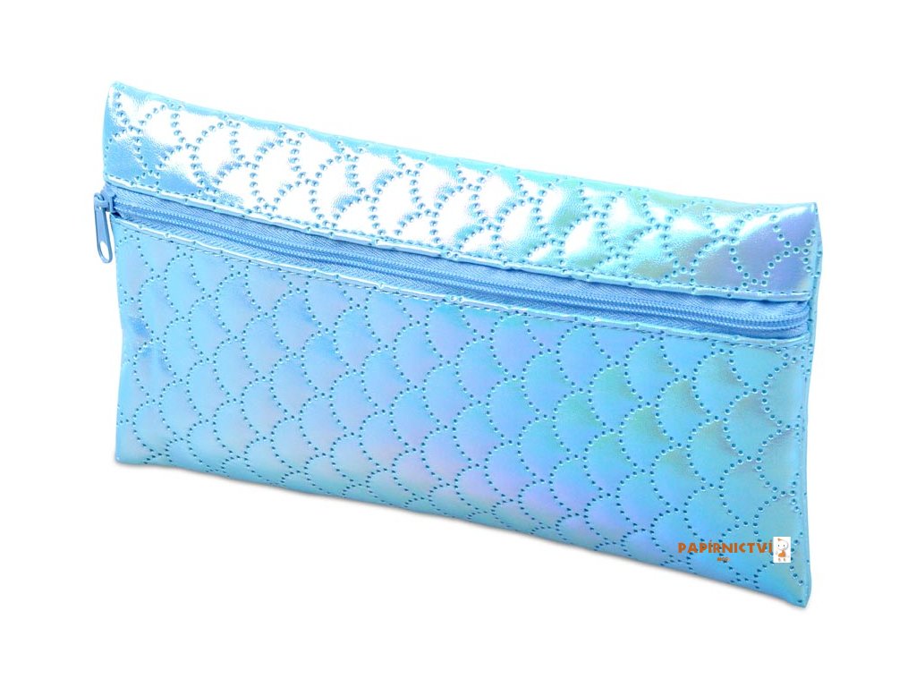 Školní penál/etue ve světle modré barvě s duhovými odlesky. Penál je plochý, s obdélníkovým tvarem, a je vybaven světle modrým zipem po celé délce, což usnadňuje přístup k uloženým věcem. Povrch penálu je prošívaný se vzorem šupin, které vytvářejí zajímavý vzhled. Penál je dostatečně prostorný, aby se do něj vešly psací potřeby, a díky svému kompaktnímu plochému tvaru se snadno vejde do batohu, kabelky nebo tašky.- není vybavený