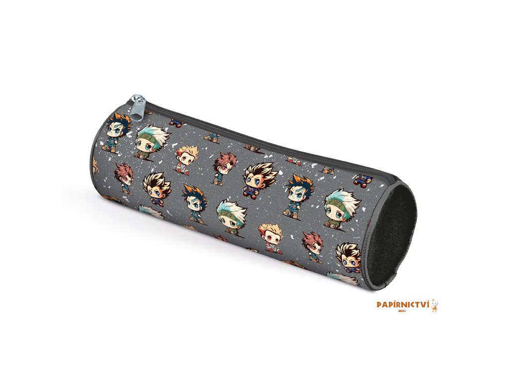 Školní penál/etue v tmavě šedé barvě s motivem anime maskotů. Penál má jednu komoru s uzavíráním na zip. Uvnitř je dostatek prostoru na všechny psací potřeby, co školák potřebuje. Vhodný především na pastelky, fixy a další psací potřeby. Etue je vyrobena z kvalitních a odolných materiálů.- není vybavený