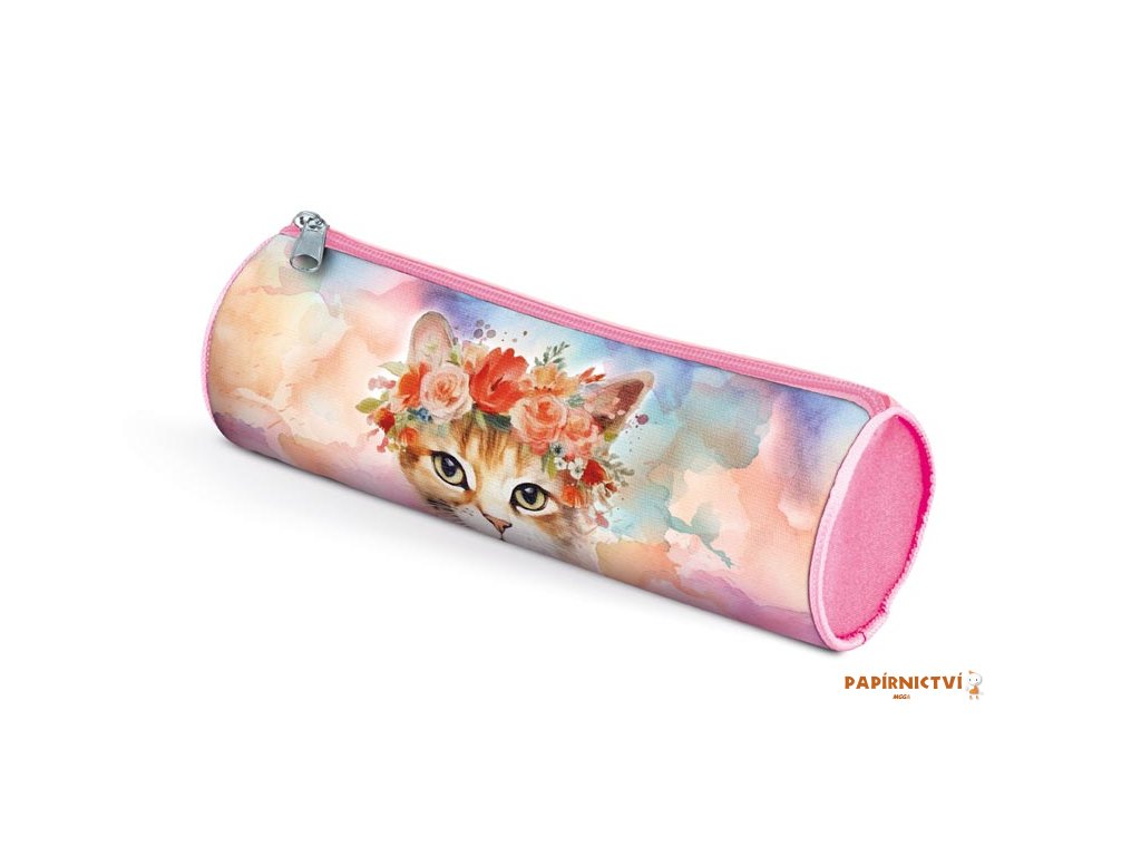 Jemnost, hravost a špetka elegance pro každý školní den!Tato roztomilá etue s motivem kočičky s květinovou korunou na pastelovém pozadí zaujme na první pohled a rozjasní každou školní lavici. Její praktický válcový tvar poskytuje dostatek prostoru pro všechny vaše psací potřeby, zatímco růžové detaily a zip dodávají celku hravý a stylový vzhled.