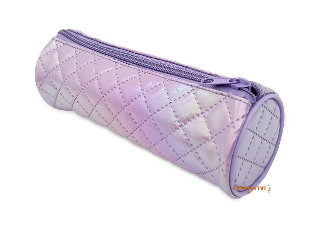 Školní penál/etue válcového tvaru v jemné fialové barvě má lesklý, perleťový povrch, který odráží světlo a mění odstíny podle úhlu pohledu. Povrch je ozdoben prošívaným vzorem ve tvaru kosočtverců. Zip a okraje penálu jsou také laděny do fialové barvy, čímž se celý design krásně sjednocuje. Je ideální pro uložení psacích potřeb, jako jsou tužky, pera či pastelky, a díky svému lesklému povrchu působí luxusním dojmem.- není vybavený