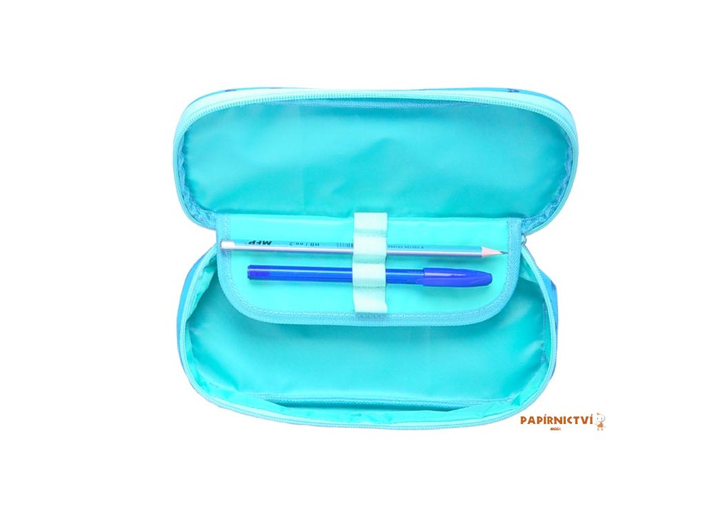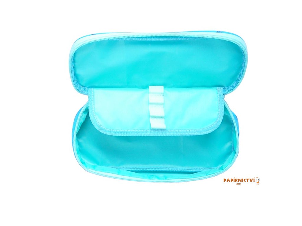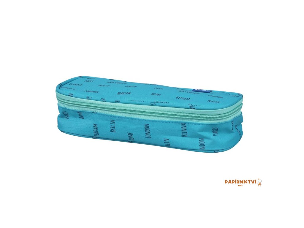 Školní penál s klopou v tyrkysové barvě s názvy měst. Je vhodným doplňkem pro studenty a větší školáky. Uvnitř je dostatek prostoru pro uložení všech psacích potřeb. Velice lehce se uzavírá díky velkému zipu.- není vybavený