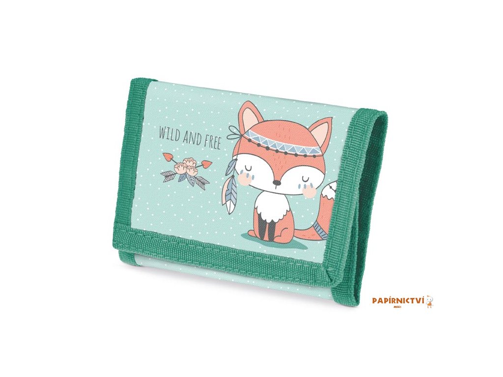 Dětská textilní peněženka ve světle zelené barvě s roztomilým motivem lišky a zapínáním na suchý zip. Peněženka má přihrádku na bankovky, mince, kapsičku vhodnou například na jízdenky a také kapsičku s průhledným okýnkem o velikosti kreditní karty.Peněženka má kovový kroužek na klíče a praktickou šňůrku pro zavěšení na krk, díky které ji vaše dítko jen tak nezapomene.