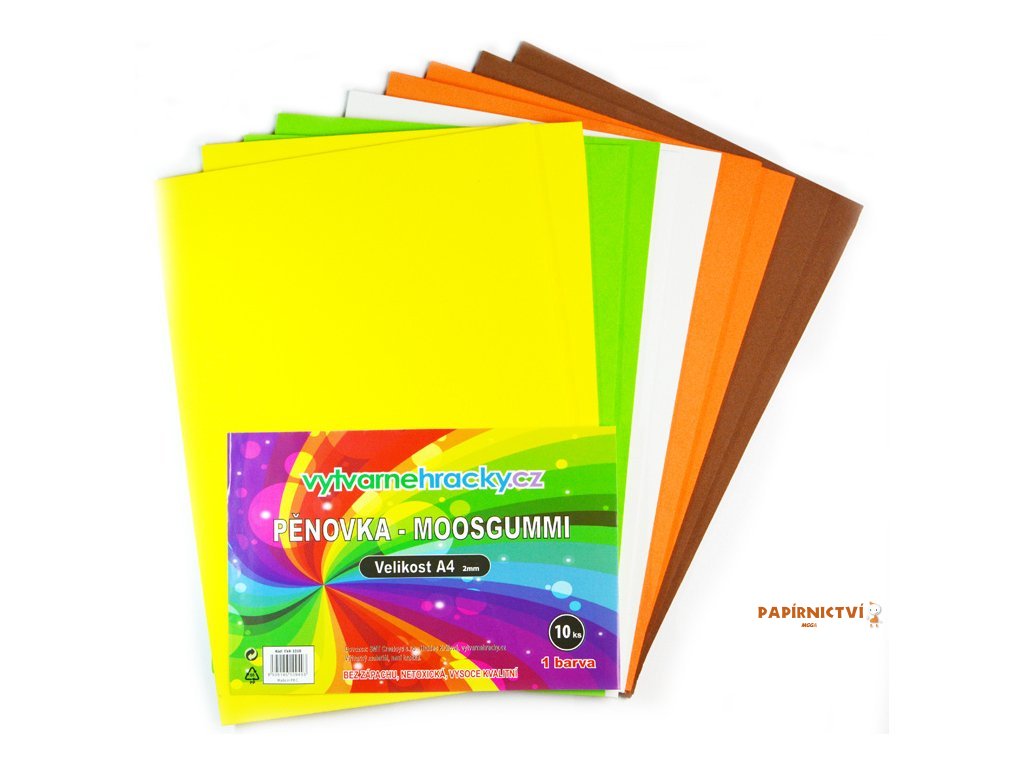Pěnovka (moosgummi) - velikonoční mix, 10 ks A4. Balení obsahuje: 2x žlutou, 2x sv. zelenou, 2x bílou, 2x oranžovou, 2x hnědou.
