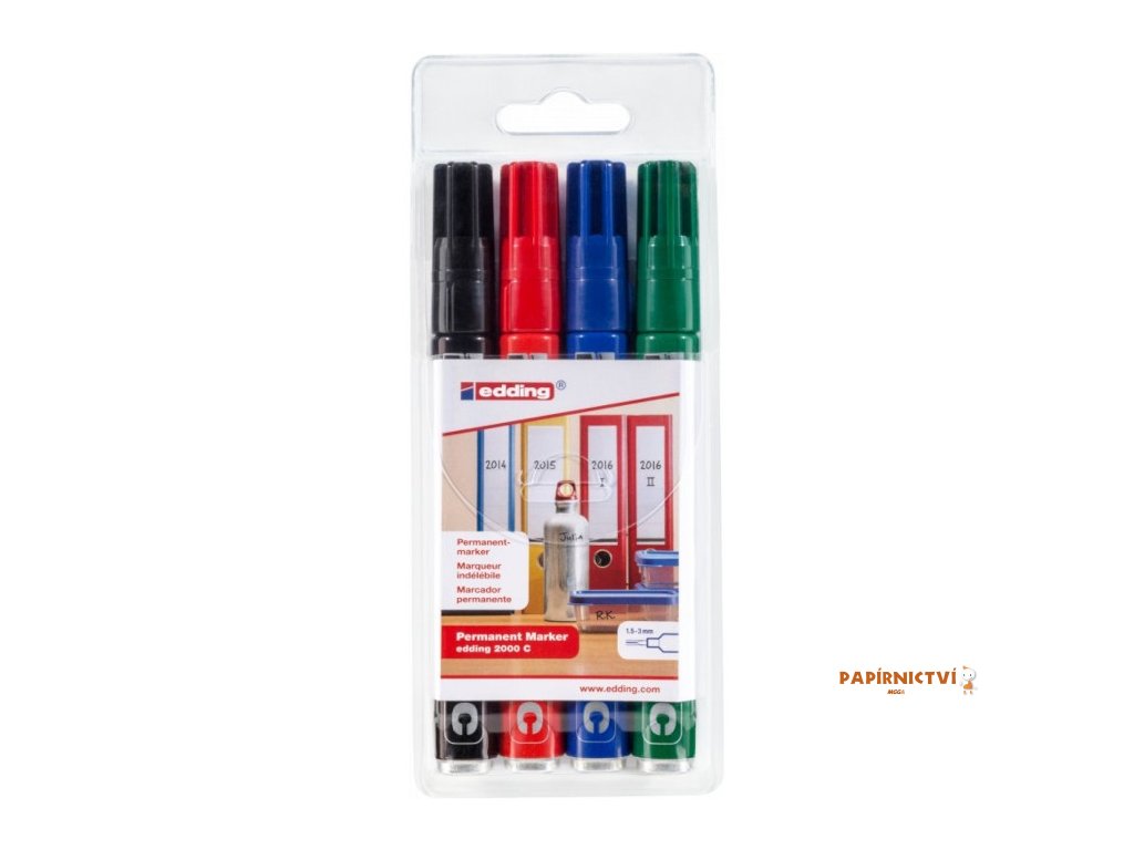 Permanentní popisovac Edding 2000 funguje dobre na papírovém povrchu, plastu, dreve, kovu, skle nebo kartonu. Odolává vode, teplu, opotrebení a rozmazání. Dodávaný v sade 4ks. Je rychleschnoucí s nízkým zápachem. Kulatý hrot má šírku stopy 1,5-3 mm. Fix je doplnitelný inkoustovými náplnemi: Edding T 25, Edding T 100 a Edding T 1000 a Edding MTK 25. K dispozici jsou náhradní hroty (Edding 3000N).Doplňkové parametry