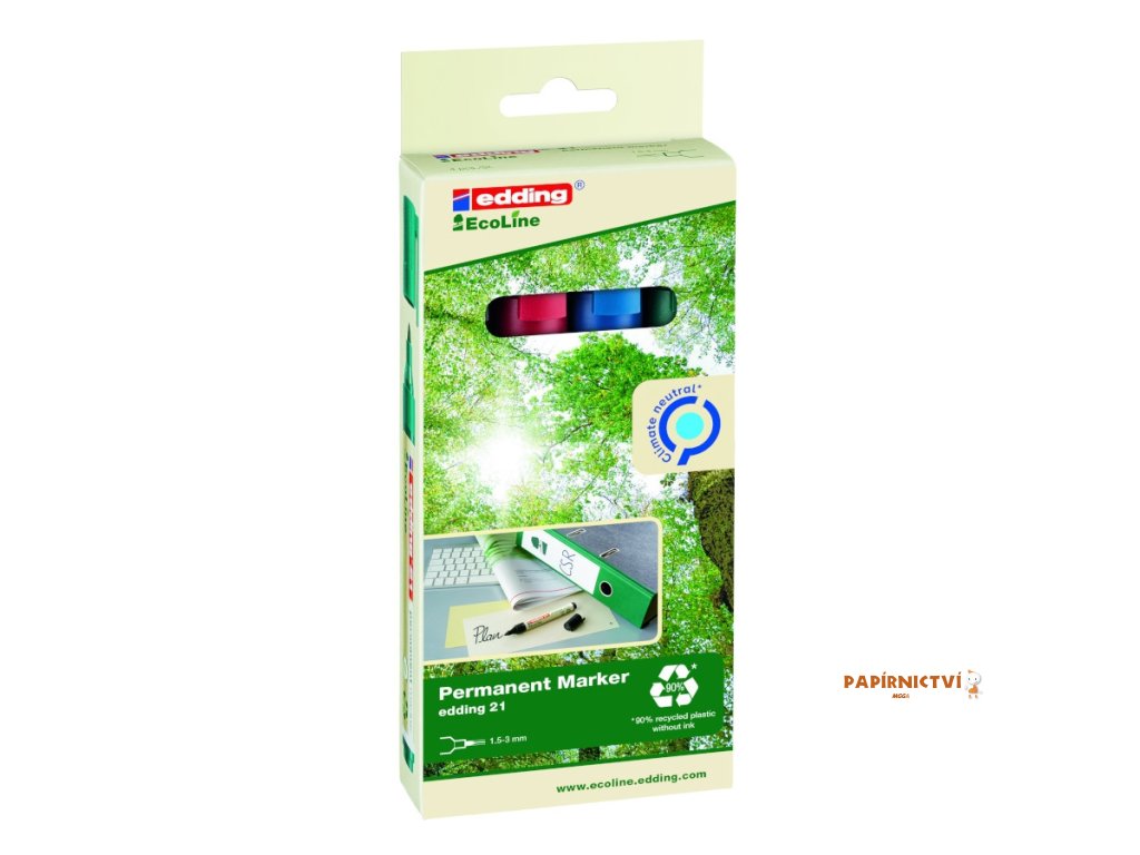 Permanentní popisovac edding 21 z ekologické rady EcoLine má telo vyrobené nejméne z 90 % z recyklovaných materiálu. Je vhodný pro popis témer všech materiálu (sklo, umelá hmota, kov, papír, karton, drevo). Rychleschnoucí, svetlostálý, vodeodolný a oteru odolný inkoust na alkoholové bázi neobsahuje toluen ani xylen. Fix je znovu naplnitelný (náhradní inkoust edding MTK 25) a jeho hroty jsou vymenitelné. Možnost naplnení vypsaného zvýraznovace i možnost výmeny hrotu pomáhá snižovat množství kancelárského odpadu. Uplatnení ve výrobe, ve skladech, v logistice, v kancelárích, v domácnostech, na zahradách i v dílnách. Využití v interiéru i exteriéru. Prodloužením životnosti popisovace pomužete snížit množství komunálního odpadu. Klimaticky neutrální produkt podle ClimatePartner (ID 13742-1910-1001). Kulatý hrot. Šíre stopy: 2-3 mm. Sada 4 barev. Vyrobeno v Nemecku.Doplňkové parametry