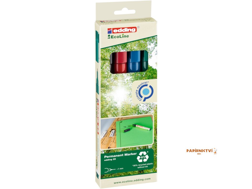 Permanentní popisovac edding 25 z ekologické rady EcoLine má telo vyrobené nejméne z 90 % z recyklovaných materiálu. Je vhodný pro popis témer všech materiálu (sklo, umelá hmota, kov, papír, karton, drevo). Rychleschnoucí, svetlostálý, vodeodolný a oteru odolný inkoust na alkoholové bázi neobsahuje toluen ani xylen. Fix je znovu naplnitelný (náhradní inkoust edding MTK25, T 25, T100, T1000) a jeho hroty jsou vymenitelné. Možnost naplnení vypsaného zvýraznovace i možnost výmeny hrotu pomáhá snižovat množství kancelárského odpadu. Uplatnení ve výrobe, ve skladech, v logistice, v kancelárích, v domácnostech, na zahradách i v dílnách. Využití v interiéru i exteriéru. Prodloužením životnosti popisovace pomužete snížit množství komunálního odpadu. Klimaticky neutrální produkt podle ClimatePartner (ID 13742-1910-1001). Sada 4 barev. Kulatý hrot. Šíre stopy: 1 mm. Vyrobeno v Nemecku.Doplňkové parametry