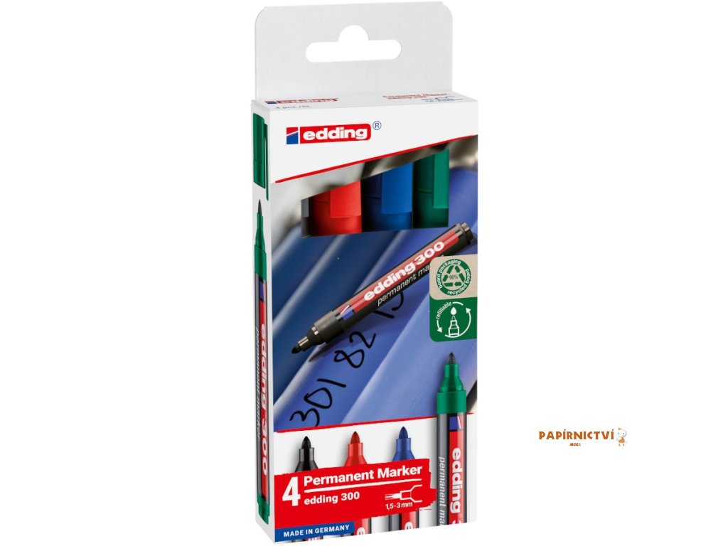 Prumyslový popisovac Edding 300, sada 4 ks. Sada ctyr barevných permanentních popisovacu s kulatým hrotem o šírce stopy 1,5–3 mm a inkoustem se slabým zápachem. Jsou vhodné pro domácnost i dílnu a skvele píší na papír, karton, kov, plast, sklo, suché drevo i kuži. Inkoust je rychleschnoucí, vodeodolný, odolný proti opotrebení i rozmazání a neobsahuje toluen ani xylén. Popisovace lze snadno znovu plnit inkoustem Edding MTK 25 (dostupným v cerné, cervené, modré a zelené barve). Sada je balena v kartonovém obalu z 90 % z certifikovaného FSC kartonu.Doplňkové parametry
