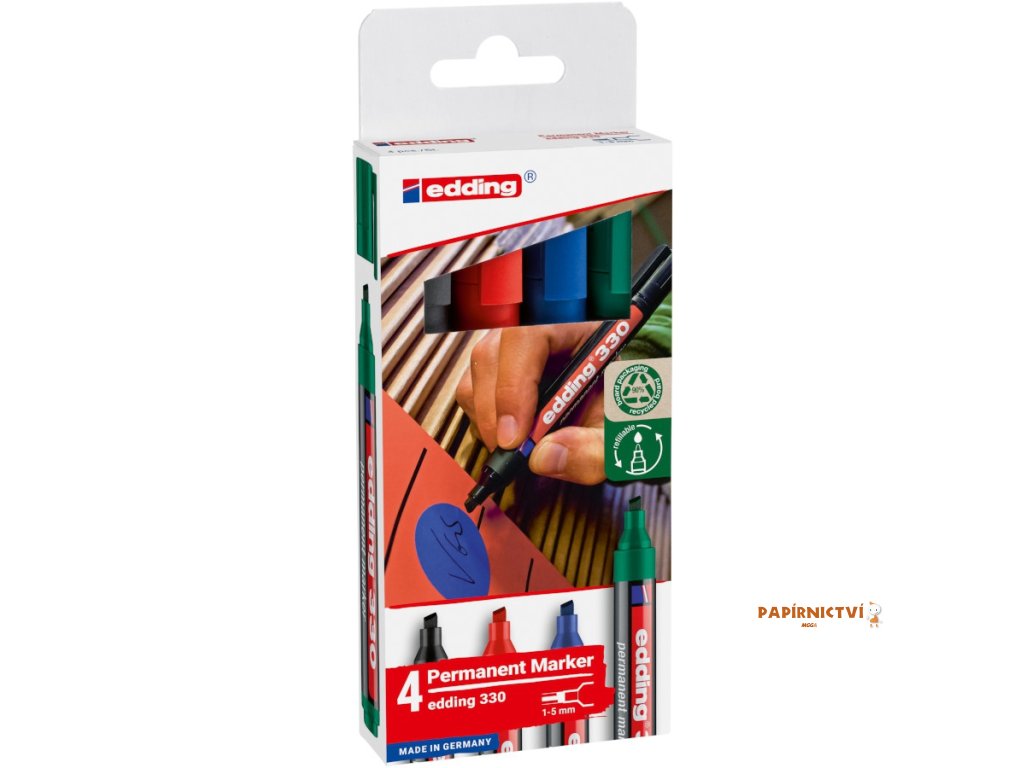 Popisovace EDDING 330 sada 4 ks. Univerzální permanentní popisovac vhodný pro každodenní použití v kancelári i domácnosti – ideální napríklad pro oznacování složek, popisování krabicek nebo sklenených nádob. Lze jej použít na ruzné povrchy, jako je plast, sklo, karton, kov, suché drevo nebo kuže. Inkoust je rychleschnoucí, vodeodolný a odolný vuci opotrebení témer na jakémkoli materiálu. Seríznutý hrot umožnuje variabilní šírku stopy od 1 do 5 mm – od jemného po výrazné znacení. Popisovac je doplnitelný pomocí náhradního inkoustu Edding MTK 25. Neobsahuje toluen ani xylen a je bez zápachu. Kartonový obal (z 90 % karton certifikovaný FSC).Doplňkové parametry