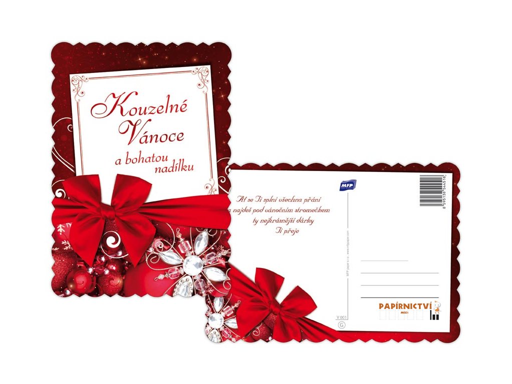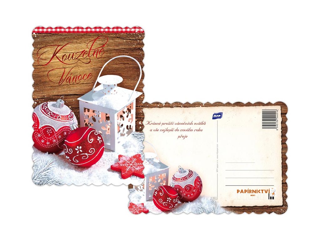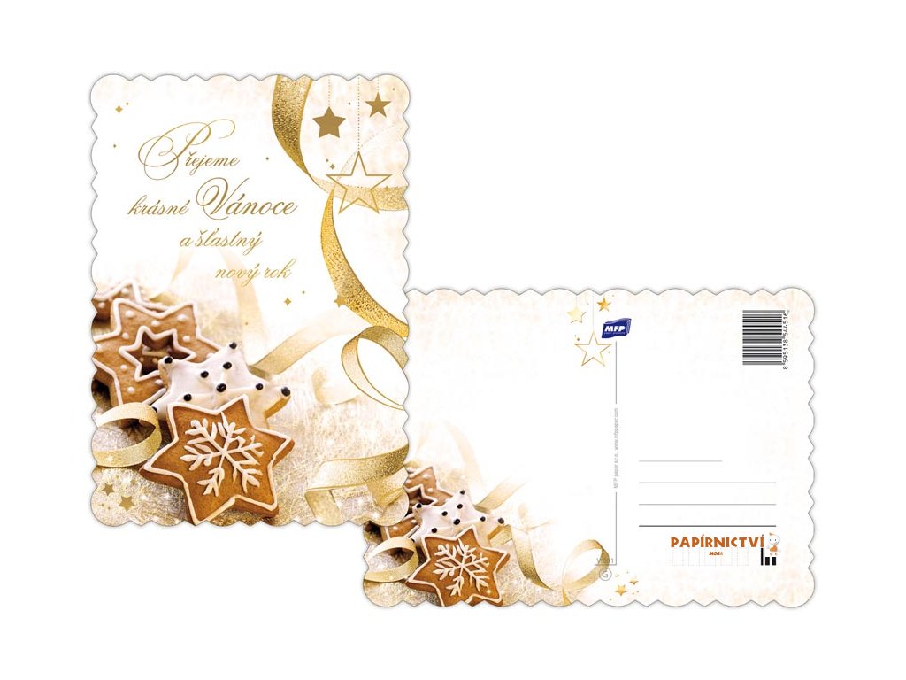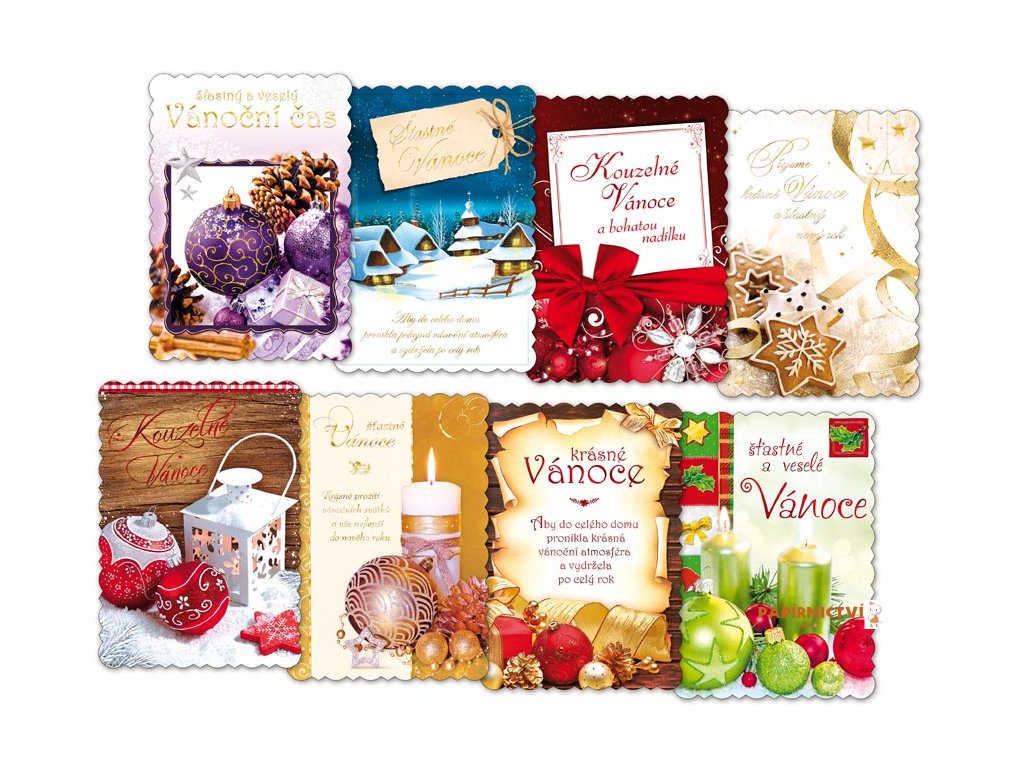Originální vánoční pohlednice velikosti A5. Díky této neobyčejné velikosti se Vaše přání bude odlišovat od ostatních. Pohlednice jsou zdobeny výsekem a termoražbou, zadní strana s je vždy s barevným vánočním obrázkem.Text na přední straně: