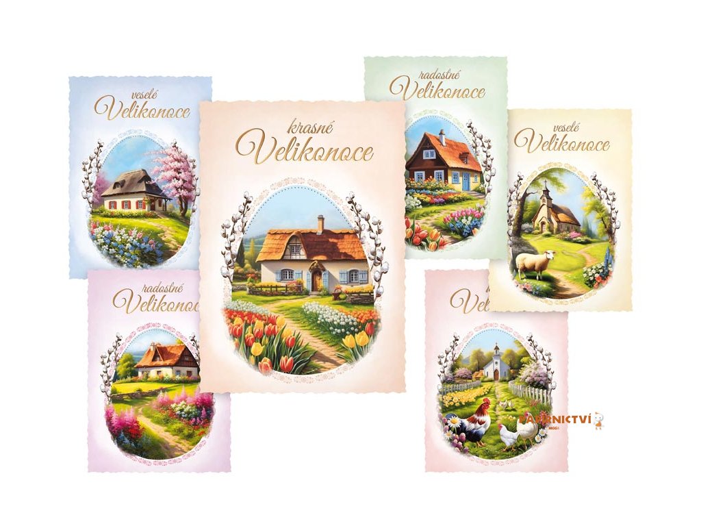 Pohlednice s velikonočními motivy. Potěšte své blízké a popřejte jim krásné svátky jara. Text na zadní straně obsahují 4 pohlednice z 6.