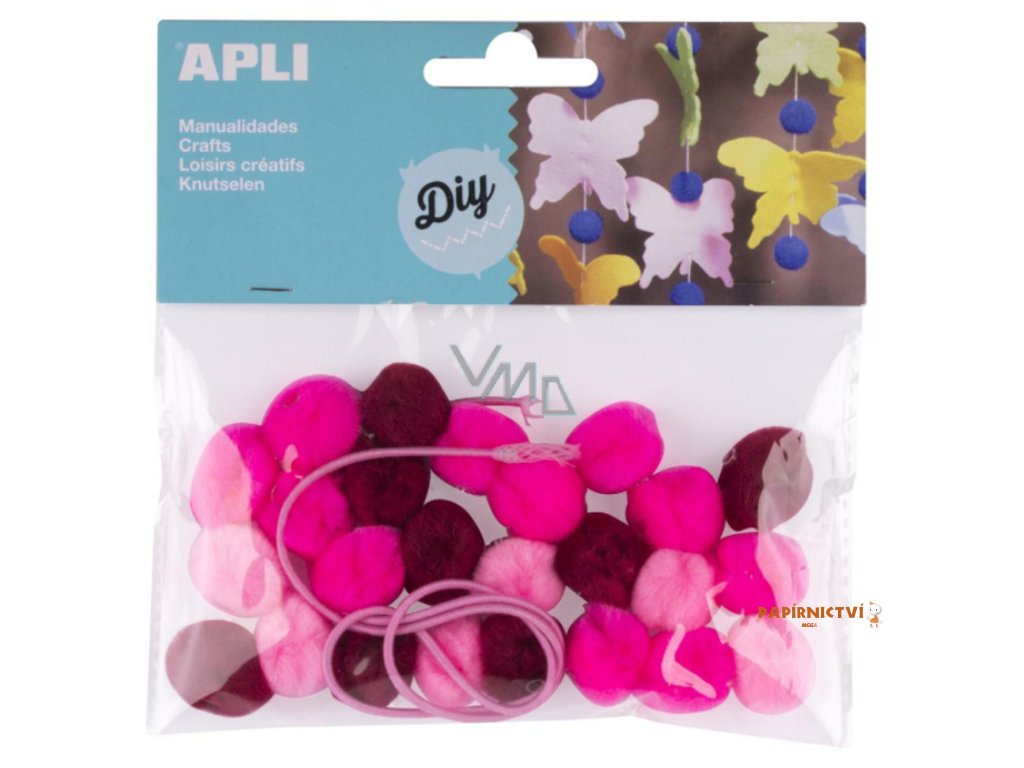 Hebké kuličky POM-POM s vnitřní dutinkou pro navlečení, mix červeno-růžových odstínů. Součástí balení je elastická šňůrka dlouhá 48 cm. Ideální pro ruční práce a výtvarné aktivity.