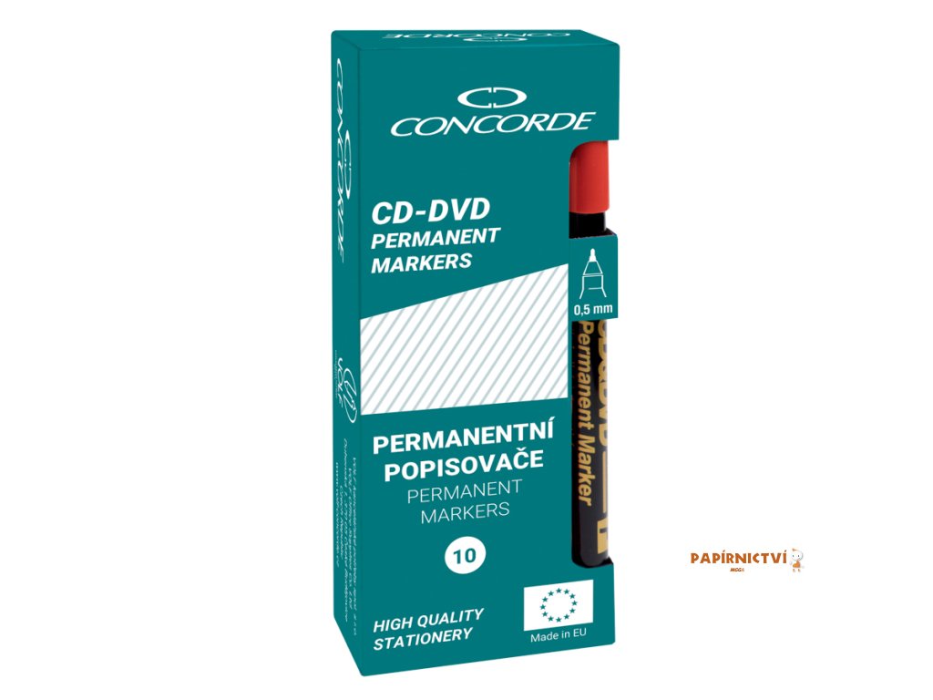 Univerzální permanentní popisovac urcený nejen na CD&DVD, ale obecne na plast, sklo, porcelán, filmy, diarámecky, rentgenové snímky. Rychleschnoucí inkoust na lihové bázi. Odolný vode a setrení, smývatelný lihem. Šíre stopy 0,5mm (F).Doplňkové parametry