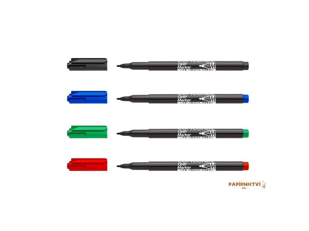 Sada 4ks permanentních OHP M popisovacu vhodných pro popis prusvitných folií, skla, umelé hmoty, dreva a kovu. Nepruhledný inkoust. Nesmazatelný a vodeodolný. Šíre stopy 1-1,5mm (M). Dodávané v mixu ctyr barev (modré, cerné, cervené a zelené).Doplňkové parametry