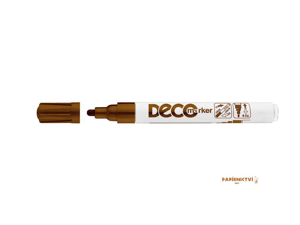 Dekorativní lakový popisovac s permanentním inkoustem na zpusob laku. Popisovac je urcený pro silne krycí znacení témer všech materiálu, napr. skla, plastu, dreva, kovu. Inkoust vhodný pro popis tmavých i pruhledných materiálu. Taktéž pro dekorativní popisování. Kulatý hrot. Šíre stopy: 2-4 mm.Doplňkové parametry
