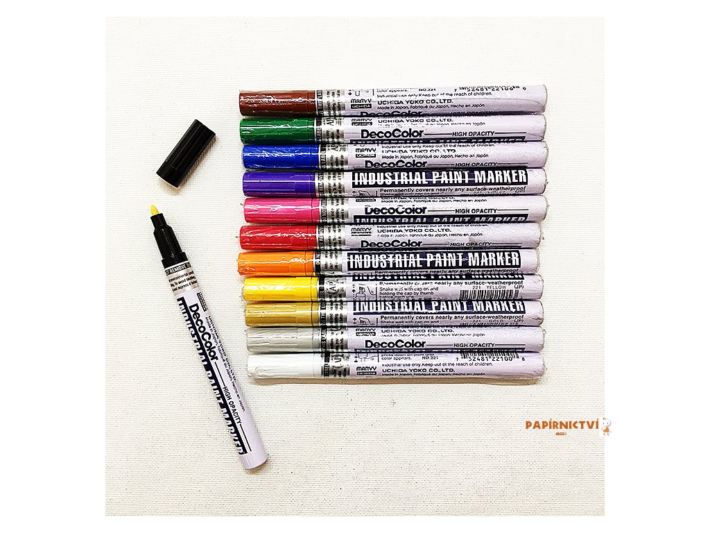 Permanentní lakový popisovač • odolný, kulatý hrot • hliníkové tělo • šíře stopy 2 mm • vhodný pro automobilový průmysl • píše na dřevo, sklo, kov, elektrické součástky nebo porcelán • možno jej použít i na mastný materiál • barva: zlatá