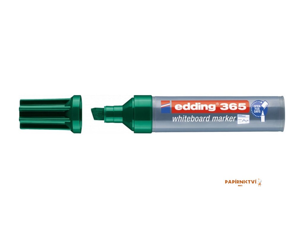 Popisovac EDDING 365 pro široké psaní a znacení na whiteboard nebo flipchart. Je vhodný pro psaní na hladké sklenené, melaminové nebo emailové povrchy a papír. Extra široký zkoseným hrot – šíre stopy 2-7 mm. Lze odstranit suchou cestou prakticky ze všech neporézních povrchu. Inkoust je rychleschnoucí, odolný vuci svetlu, bez pridaného butylacetátu, s nízkým zápachem. Technologie „cap-off“ - popisovac mužete nechat bez vícka i nekolik dní, aniž by vyschl (testováno podle normy ISO 554). Fix je možné znovu naplnit pomocí EDDING BT 30. K dispozici jsou i náhradní hroty (EDDING 365). Popisovac skladujte ideálne ve vodorovné poloze.Doplňkové parametry