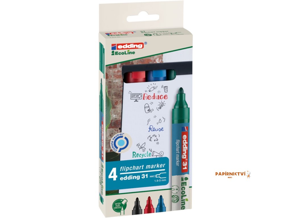 Permanentní ekologický fix z rady Ecoline je ideální pro psaní na flipchartový papír, prezentacní papír. Nejméne 90 % celkového plastu použitého v popisovaci je vyrobeno z recyklovaného materiálu. K dispozici je v cerné, cervené, modré a zelené barve. Je vybaven kulatým hrotem o šírce stopy 1,5-3 mm. Rychleschnoucí, doplnitelný, odolný vuci svetlu. Díky technologii „cap-off“ lze nechat fix i nekolik týdnu bez vícka, aniž by vyschl (ISO 554).Doplňkové parametry
