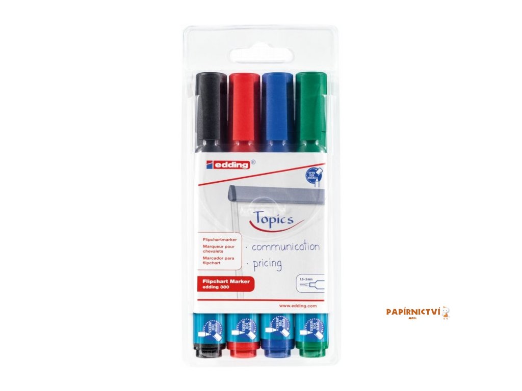 Sada 4ks popisovacu EDDING 380 na flipchart (tj. prenosnou papírovou tabuli) nebo jiné papíry používané k prezentacím. Šírka stopy 1,5-3 mm. Jeho barvy zustávají živé a neblednou i pri delších textech nebo vizualizacích. Díky technologii „cap-off“ muže zustat otevrený (bez vícka) i nekolik týdnu, aniž by vyschl. I po tak dlouhé dobe bude psát, jako když byl otevren poprvé (testováno podle normy ISO 554). Je rychleschnoucí a odolný vuci rozmazání. Díky speciálnímu inkoustu nedochází k prosakování barvy skrz papír. Má neutrální vuni. Náhradní hroty - Edding 30/31/380. Skladujte ve vodorovné poloze.Flipchartový popisovac EDDING 380, sada 4 ksDoplňkové parametry