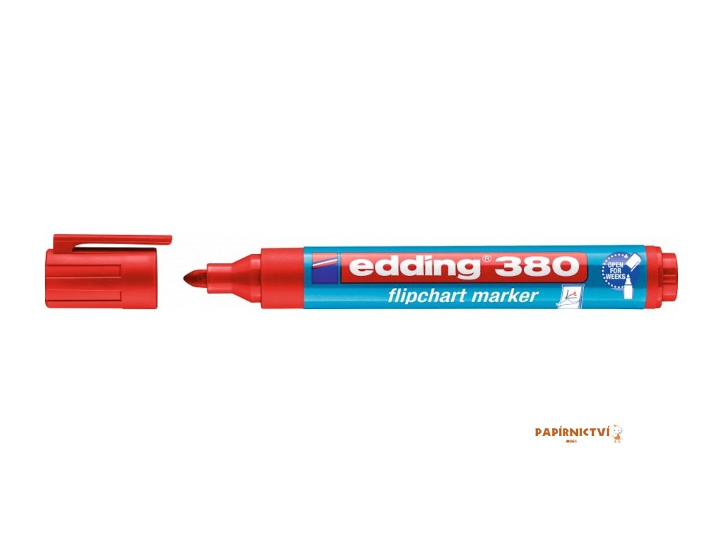 EDDING 380 na flipchart (tj. prenosnou papírovou tabuli) nebo jiné papíry používané k prezentacím. Šírka stopy 1,5-3 mm. Jeho barvy zustávají živé a neblednou i pri delších textech nebo vizualizacích. Díky technologii „cap-off“ muže zustat otevrený (bez vícka) i nekolik týdnu, aniž by vyschl. I po tak dlouhé dobe bude psát, jako když byl otevren poprvé (testováno podle normy ISO 554). Je rychleschnoucí a odolný vuci rozmazání. Díky speciálnímu inkoustu nedochází k prosakování barvy skrz papír. Má neutrální vuni. Náhradní hroty - Edding 30/31/380. Skladujte ve vodorovné poloze.Doplňkové parametry