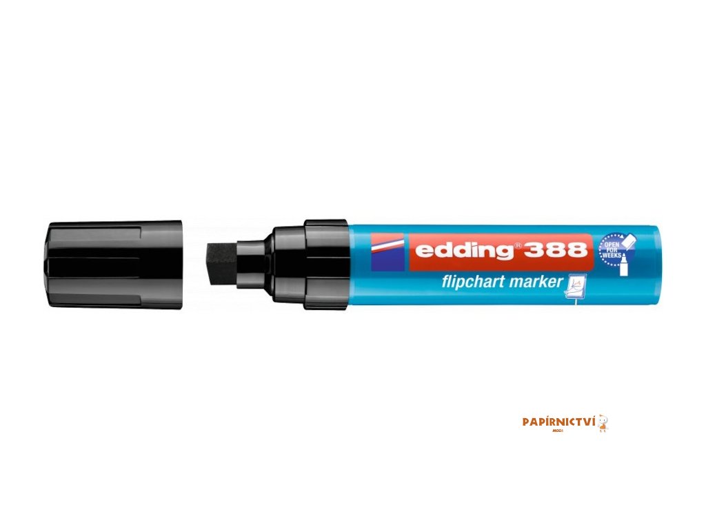 Popisovac EDDING 388 na flipchart (prenosná papírová tabule) nebo jiné papíry používané k prezentacím. Extra široké psaní, zkosený hrot s šírkou stopy 4-12 mm umožnuje psát ruznorodým stylem. Díky technologii „cap-off“ muže zustat otevrený (bez vícka) i nekolik týdnu, aniž by vyschl. I po tak dlouhé dobe bude psát, jako když byl otevren poprvé (testováno podle normy ISO 554). Je rychleschnoucí a odolný vuci rozmazání. Díky speciálnímu inkoustu nedochází k prosakování barvy skrz papír. Barvy popisovace jsou živé a neblednou, a to i pri delších textech nebo vizualizacích. Neutrální vune.Doplňkové parametry