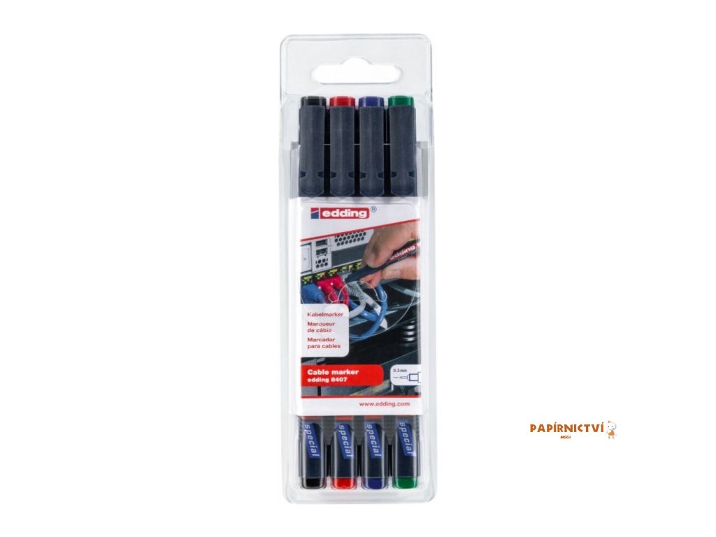 Popisovac na kabely EDDING 8407 je ideální volbou pro elektrikáre, ale i pro domácí kutily. Extrémne jemný a kulatý hrot o šírce stopy 0,3mm umožnuje pohodlné popisování i tech nejtencích kabelu. Inkoust je permanentní, rychleschnoucí, vodeodolný, svetlostálý a odolný vuci rozmazání a opotrebení. Bez pridaného xylenu / toluenu, s nízkým zápachem. K dispozici v sade o ctyrech barvách (cerná, cervená, modrá a zelená). Popisovac má klip pro pohodlné pripevnení, napr. k odevu.Doplňkové parametry