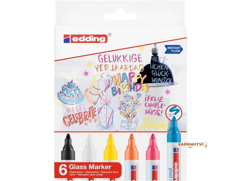 Popisovac na všechny sklenené povrchy. Vynikající krycí schopnost - zárivé barvy zajistí, že je stopa i na barevném skle dobre viditelná, inkoust je rychleschnoucí a nezanechává žádný mastný film. Popisovac využijete na sklo, sklenené tabule, zrcadla i na bílé tabule. Praktickou vlastností je smazatelnost stopy zasucha - není nutné používat vlhký hadr. Popisovac je ihned použitelný - stací sejmout vícko a psát. Kulatý hrot. Šíre hrotu 1,5-3 mm.Doplňkové parametry