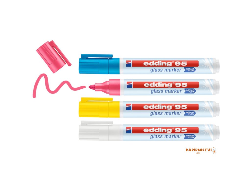 Popisovac edding 95 na všechny sklenené povrchy. Inovativní inkoust nabízí vynikající krycí schopnost - zárivé barvy zajistí, že je stopa i na barevném skle dobre viditelná. Popisovac využijete na sklo, sklenené tabule, zrcadla i na bílé tabule. Praktickou vlastností je smazatelnost stopy zasucha - není nutné používat vlhký hadr. Inkoust je rychleschnoucí a nezanechává žádný mastný film. Popisovac je ihned použitelný - stací sejmout vícko a psát. Užitecný je predevším pri prezentacích, schuzkách i pri bežném zapisování poznámek a myšlenek. Ideální je také pro docasné vzkazy na zrcadlech nebo pro vyzdobení oken. Sada 4 barev: cerná, oranžová, ružová a svetle modrá. Barvy oranžová a ružová jsou fluorescentní pod UV lampou. Kulatý hrot. Šíre stopy: 1,5-3 mm. Vyrobeno v Nemecku.Doplňkové parametry