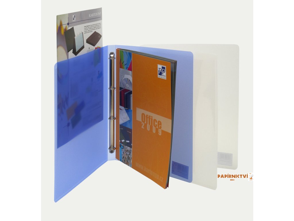Kroužkový pořadač z extra silného polypropylenu, 4kroužková mechanika, hřbet šířky 2 cm, průhledná přední kapsa pro vložení letáku.