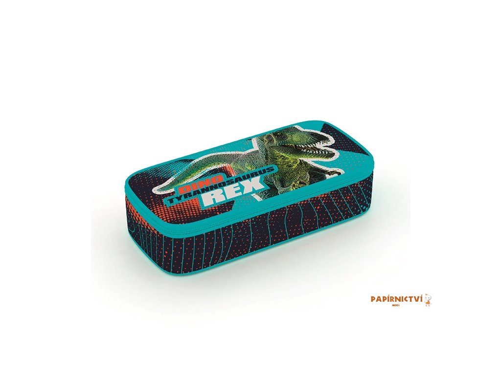 Školní pouzdro etue s motivem dinosaura. Pouzdro je opatřeno pevnými zipy, kapsičkou na zip a klopou s pevnými poutky po obou stranách. Pod klopou je místo pro volné uložení psacích potřeb nebo jiných drobností. Vhodné pro školáky na 2. stupni a starší studenty.