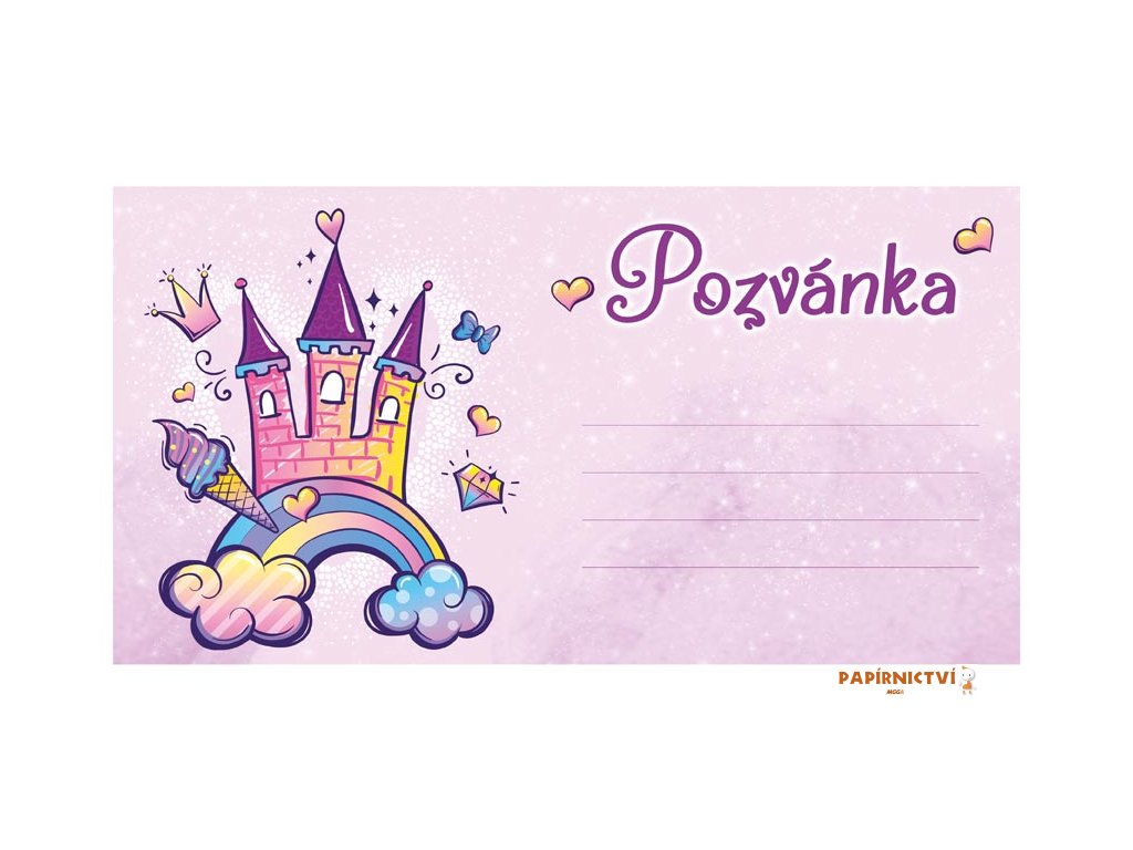 Dětská pozvánka na oslavu s obrázkem pohádkového hradu.