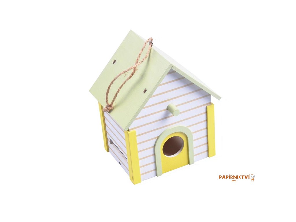 Jarní dekorace ptačí budka ze dřeva na pověšení. Ptačí budka je v bílé barvě se žlutými pruhy, zelenou střechou a bydlem. Je opatřena jutovým provázkem pro snadné zavěšení. Lze ji tedy pověsit nebo může sloužit jako dekorace na postavení.Materiál: dřevo